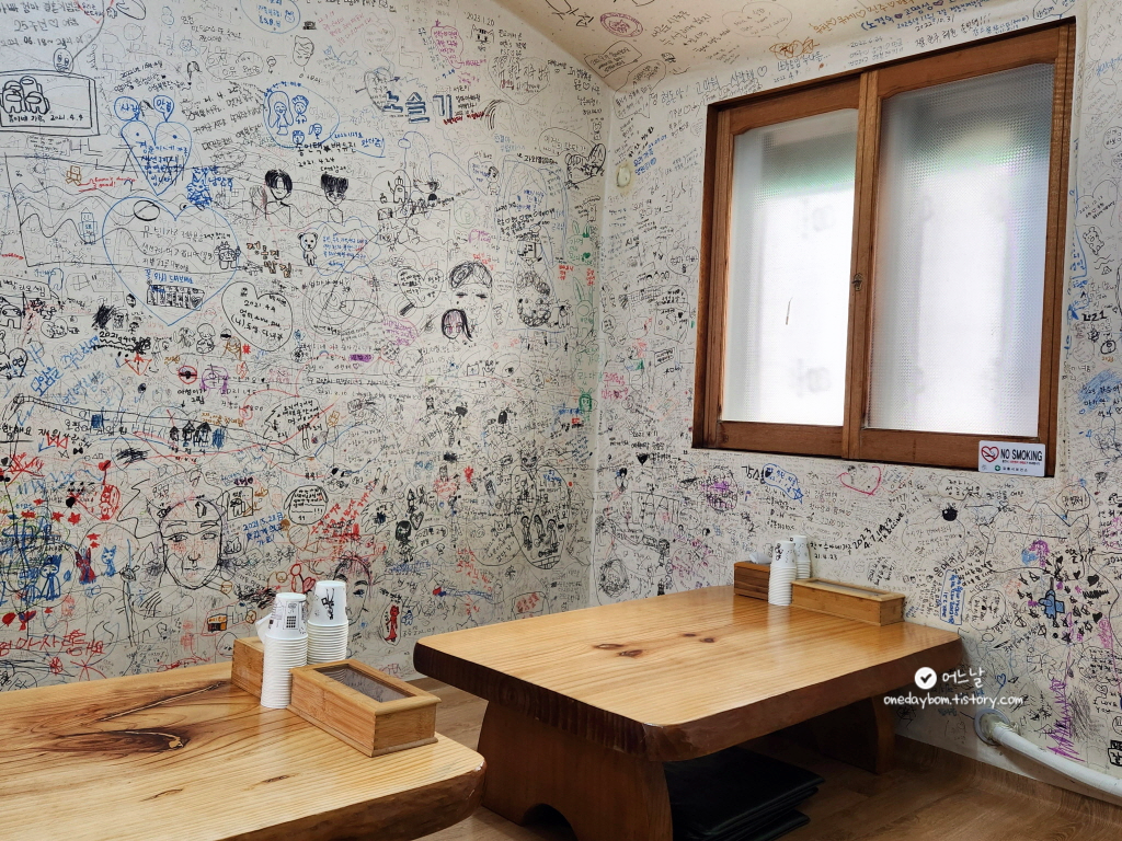안으로 들어가면 주택구조에다가 낙서가 되어 있는 벽지, 좌식으로 놓인 나무테이블~